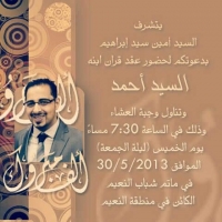 يتشرف السيد أمين سيد هاشم بدعوتكم لحضور عقد قران نجله " السيد أحمد " مساء الخميس ليلة الجمعة الموافق 2013/5/30م.
