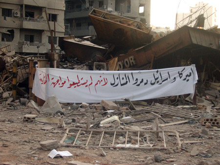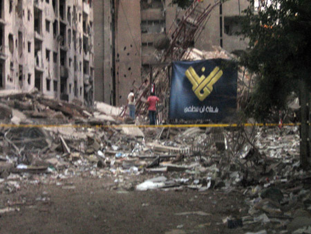 نشاهد بيت السيد حسن نصر الله وقد استهدفته الطائرات بعدة غارات حتى ساوت به الأرض (إنها فعل القنابل الذكية)، نشاهد قناة المنار وأعمدة الإرسال بارزة للعيان وسط ركام أكثر من 8 عمارات – أمامنا مدرسة المستقبل وقد سويت بالأرض – مؤسسة الشهيد مكونة من 10 طوابق لم تنجو من القصف.