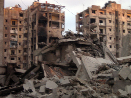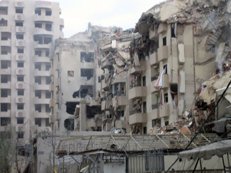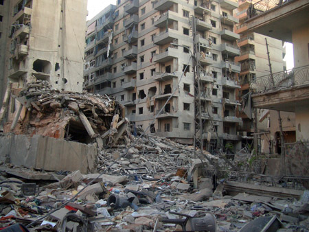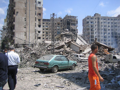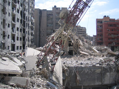 نعبر من شارع إلى شارع فوق الركام في حارة حريك عمارات مهدومة وبعضها محترق وبعض العمارات نصفها مهدم والبعض محطم النوافذ والأبواب.