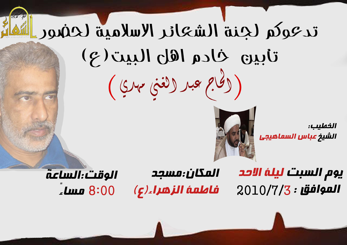 لجنة الشعائر الاسلامية -مدينة حمد- تدعوكم لحضور تأبين خادم أهل البيت (ع) الحاج عبدالغني مهدي