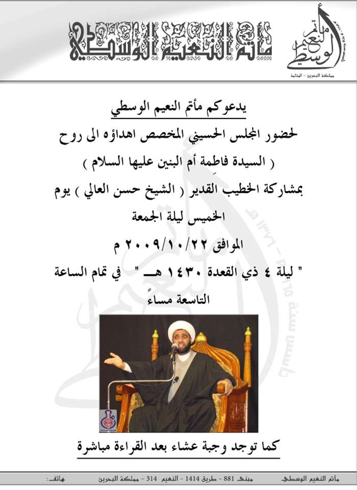 إعلان : موعدكم مع الشيخ حسن العالي .. ليلة الجمعة القادمة في مأتم النعيم الوسطي